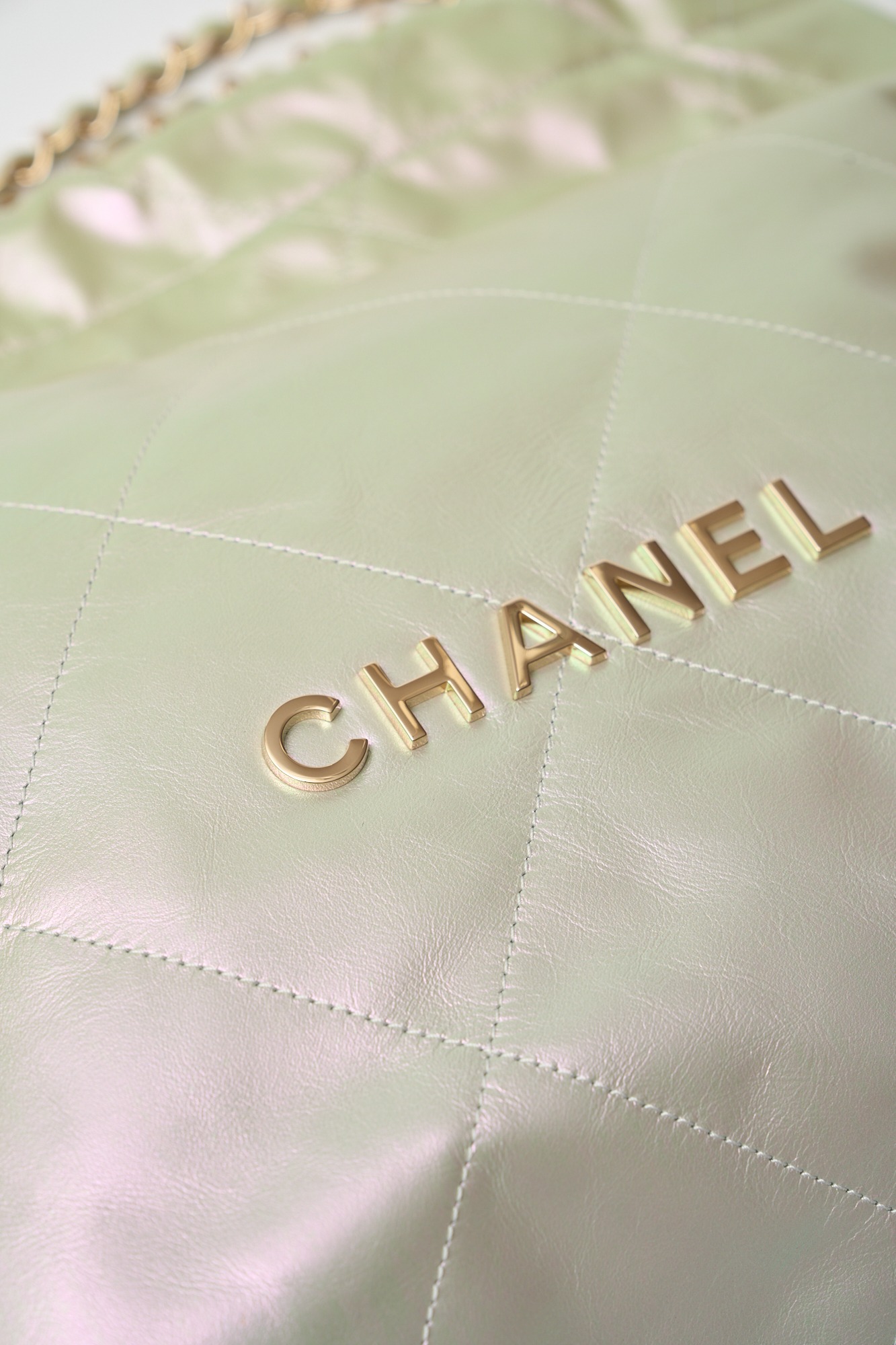 The Chanel 22 Small is a modern icon of the house, admired for its relaxed silhouette and effortless, contemporary appeal. This brand new example is crafted in striking iridescent silver, offering a luminous metallic finish that subtly shifts with the light for a bold yet refined statement. The softly structured design is accented with gold-tone metal hardware, including the signature CHANEL logo, creating a sophisticated contrast.