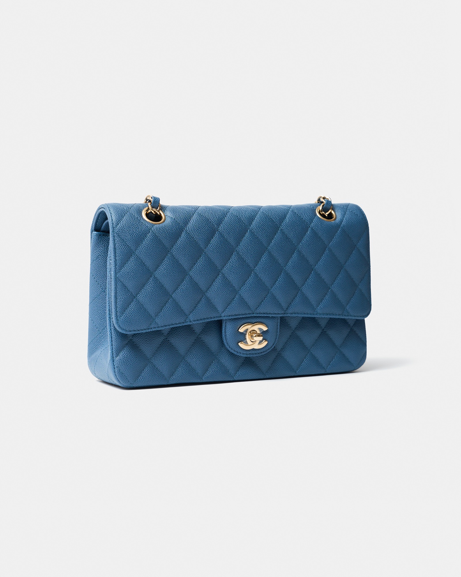 The Chanel Classic Medium Double Flap is one of the house’s most iconic and enduring designs, revered for its timeless silhouette and impeccable craftsmanship. This brand new example is crafted in rich blue caviar leather, offering a sophisticated pop of color while maintaining exceptional durability and structure. The signature diamond quilting is beautifully complemented by gold-tone metal hardware, including the iconic CC turn-lock closure, creating a refined and elegant finish.