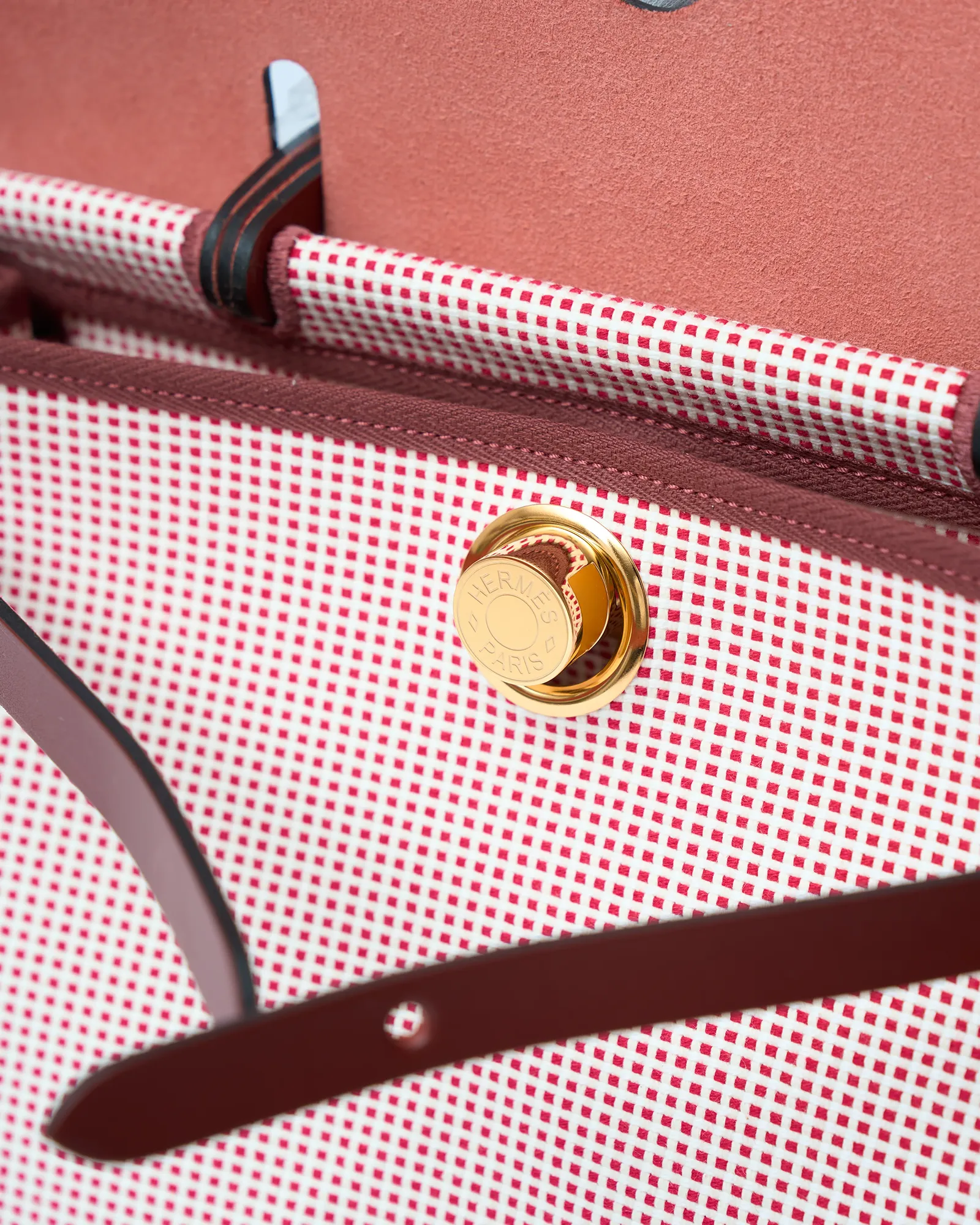 The Hermès Herbag 31 is a refined yet practical design, often considered the contemporary alternative to the Kelly. This brand new example features vibrant Framboise Quadrille toile, paired with rich Rouge H leather trim, creating a bold yet unmistakably elegant color combination. The structured canvas body offers durability and lightness, while the leather accents highlight Hermès’ exceptional craftsmanship.